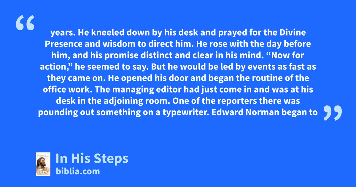 years. He kneeled down by his desk and prayed for the Divine Presence and wisdom to direct him. He rose with the day before him, and his promise distinct and clear in his mind. “Now for action,” he seemed to say. But he would be led by events as fast as they came on. He opened his door and began the routine of the office work. The managing editor had just come in and was at his desk in the adjoining room. One of the reporters there was pounding out something on a typewriter. Edward Norman began to