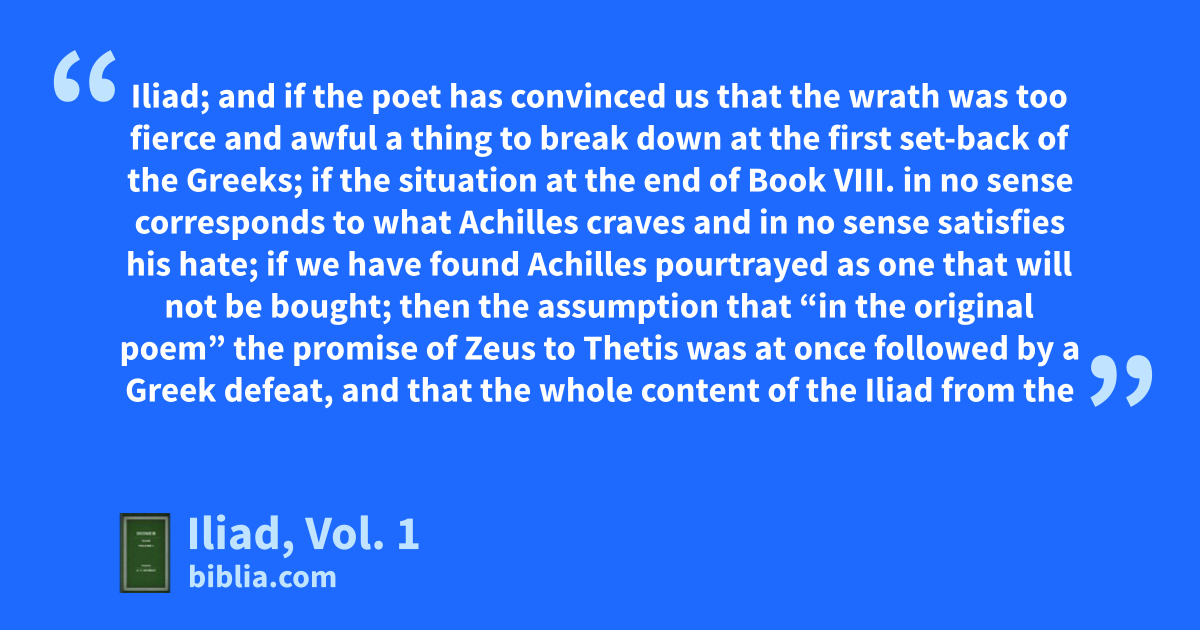 Iliad; and if the poet has convinced us that the wrath was too fierce and awful a thing to break down at the first set-back of the Greeks; if the situation at the end of Book VIII. in no sense corresponds to what Achilles craves and in no sense satisfies his hate; if we have found Achilles pourtrayed as one that will not be bought; then the assumption that “in the original poem” the promise of Zeus to Thetis was at once followed by a Greek defeat, and that the whole content of the Iliad from the