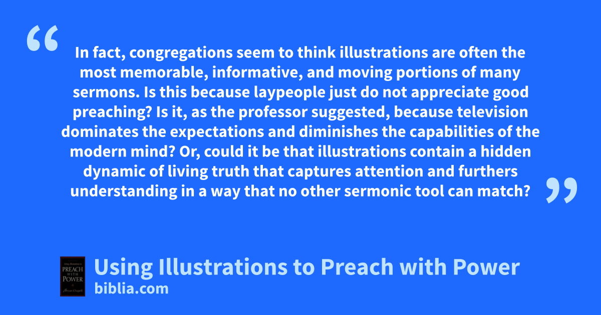 In fact, congregations seem to think illustrations are often the most memorable, informative, and moving portions of many sermons. Is this because laypeople just do not appreciate good preaching? Is it, as the professor suggested, because television dominates the expectations and diminishes the capabilities of the modern mind? Or, could it be that illustrations contain a hidden dynamic of living truth that captures attention and furthers understanding in a way that no other sermonic tool can match?