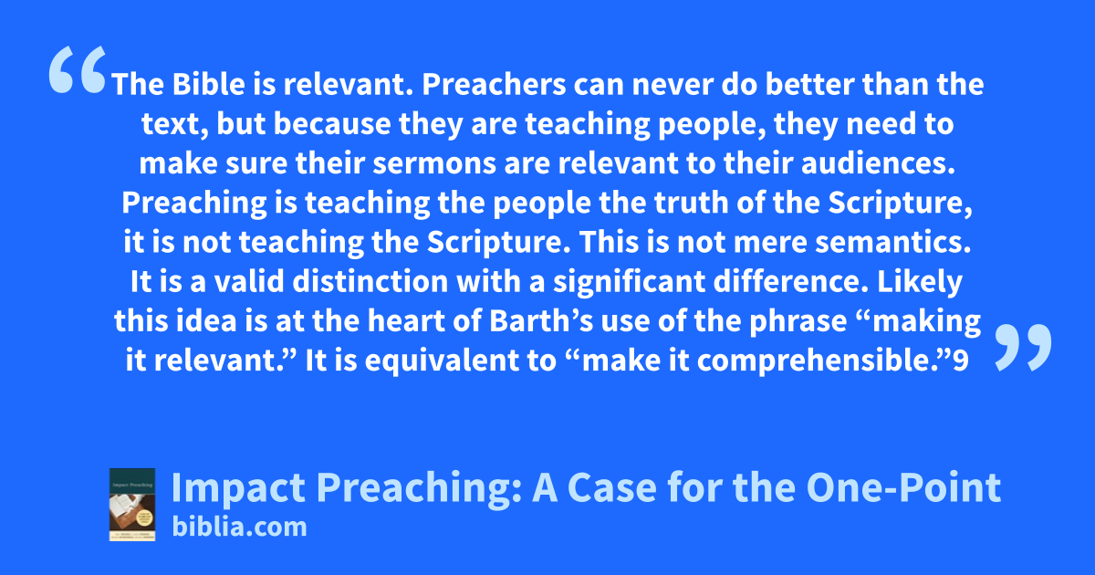 The Bible is relevant. Preachers can never do better than the text, but because they are teaching people, they need to make sure their sermons are relevant to their audiences. Preaching is teaching the people the truth of the Scripture, it is not teaching the Scripture. This is not mere semantics. It is a valid distinction with a significant difference. Likely this idea is at the heart of Barth’s use of the phrase “making it relevant.” It is equivalent to “make it comprehensible.”9