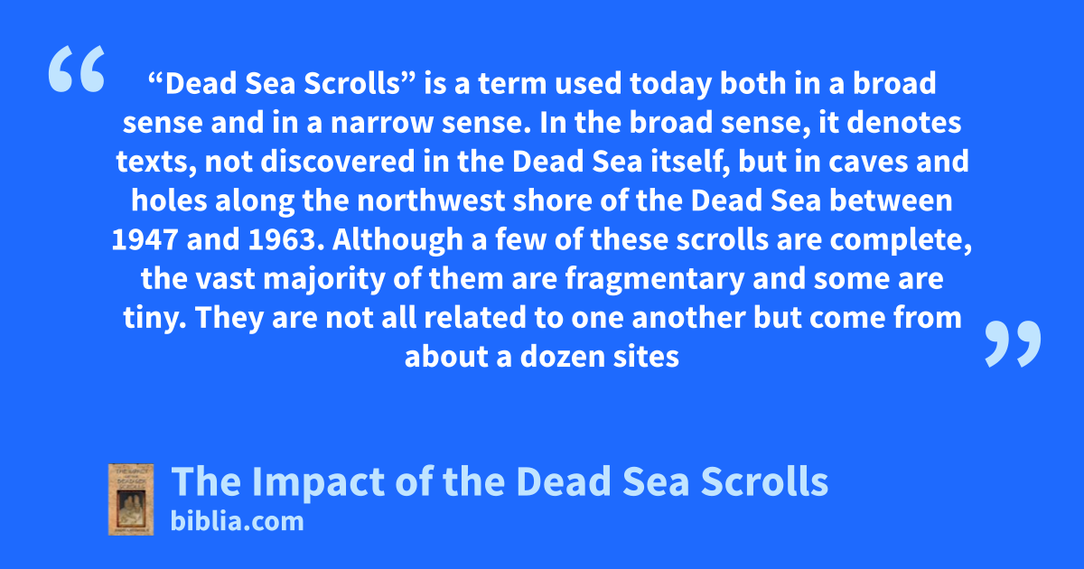 “Dead Sea Scrolls” is a term used today both in a broad sense and in a narrow sense. In the broad sense, it denotes texts, not discovered in the Dead Sea itself, but in caves and holes along the northwest shore of the Dead Sea between 1947 and 1963. Although a few of these scrolls are complete, the vast majority of them are fragmentary and some are tiny. They are not all related to one another but come from about a dozen sites