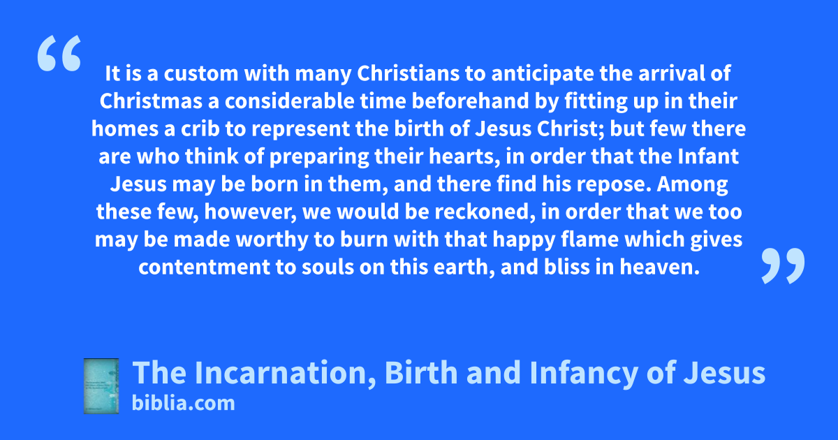 It is a custom with many Christians to anticipate the arrival of Christmas a considerable time beforehand by fitting up in their homes a crib to represent the birth of Jesus Christ; but few there are who think of preparing their hearts, in order that the Infant Jesus may be born in them, and there find his repose. Among these few, however, we would be reckoned, in order that we too may be made worthy to burn with that happy flame which gives contentment to souls on this earth, and bliss in heaven.
