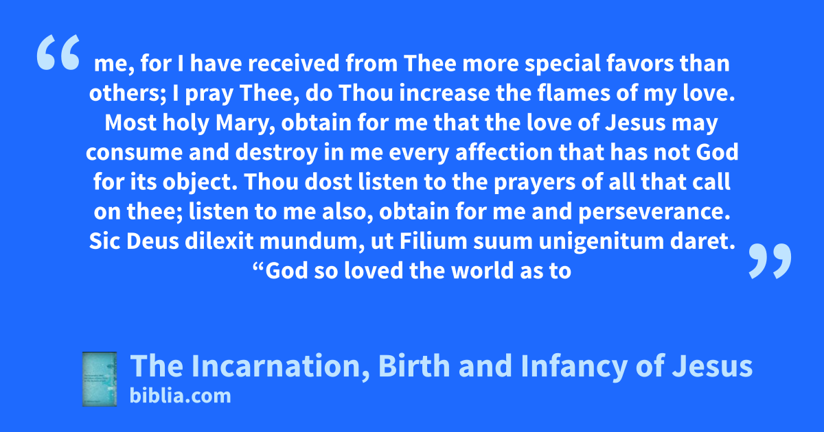 me, for I have received from Thee more special favors than others; I pray Thee, do Thou increase the flames of my love. Most holy Mary, obtain for me that the love of Jesus may consume and destroy in me every affection that has not God for its object. Thou dost listen to the prayers of all that call on thee; listen to me also, obtain for me and perseverance. Sic Deus dilexit mundum, ut Filium suum unigenitum daret. “God so loved the world as to