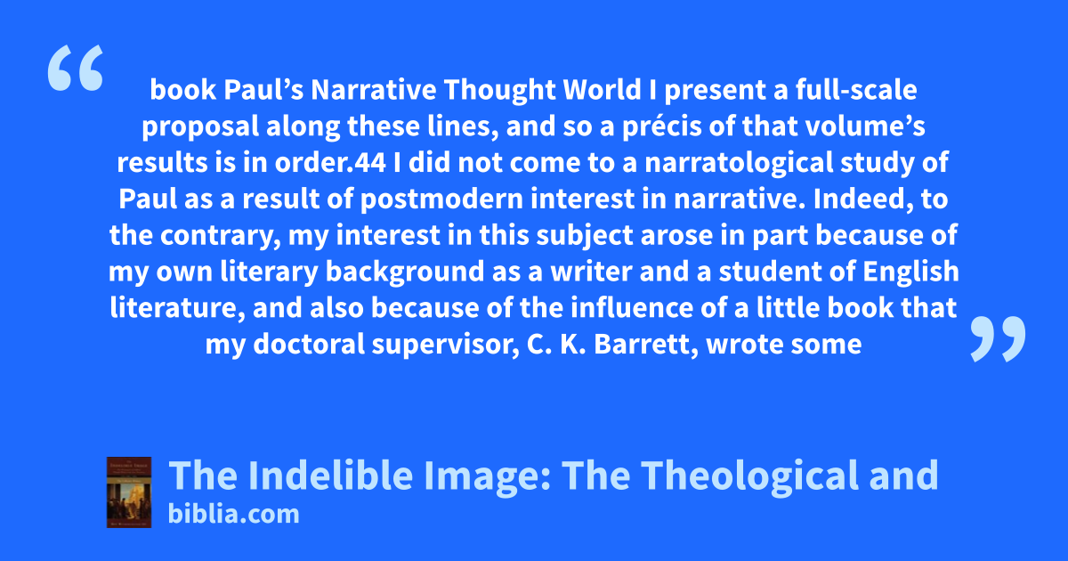 book Paul’s Narrative Thought World I present a full-scale proposal along these lines, and so a précis of that volume’s results is in order.44 I did not come to a narratological study of Paul as a result of postmodern interest in narrative. Indeed, to the contrary, my interest in this subject arose in part because of my own literary background as a writer and a student of English literature, and also because of the influence of a little book that my doctoral supervisor, C. K. Barrett, wrote some