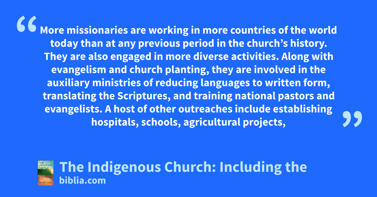 More missionaries are working in more countries of the world today than at any previous period in the church’s history. They are also engaged in more diverse activities. Along with evangelism and church planting, they are involved in the auxiliary ministries of reducing languages to written form, translating the Scriptures, and training national pastors and evangelists. A host of other outreaches include establishing hospitals, schools, agricultural projects,