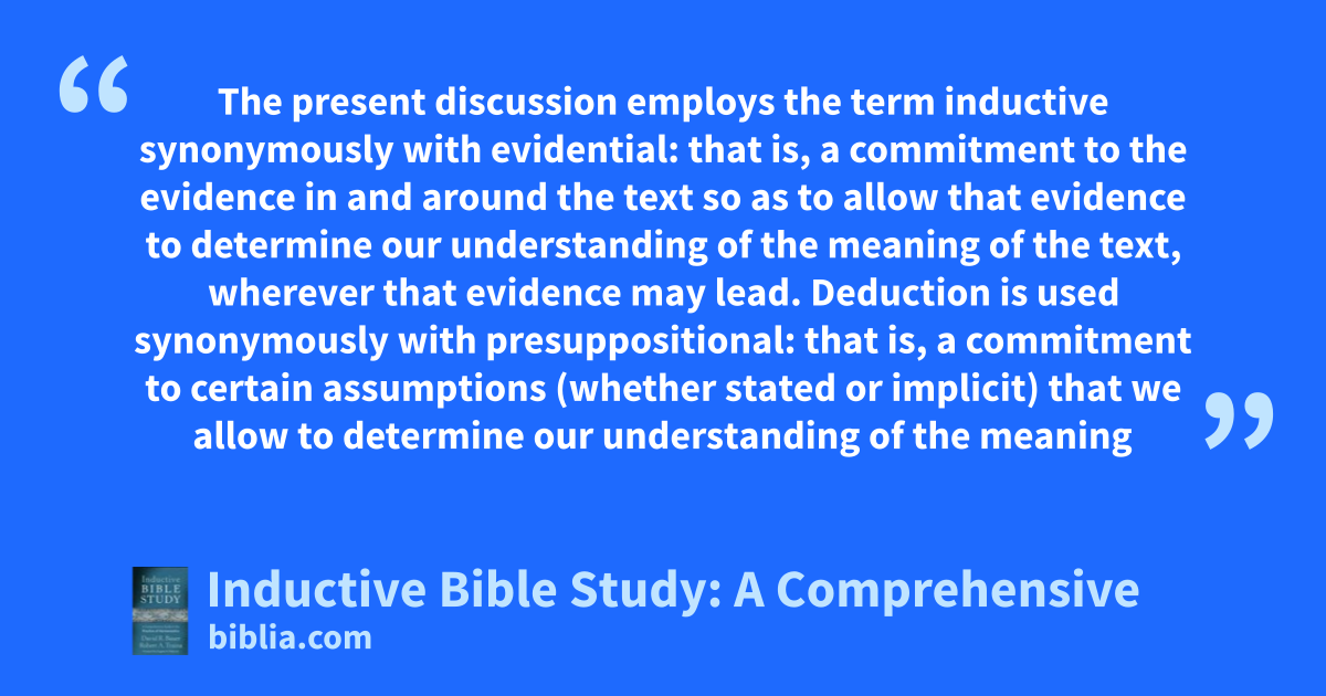 The present discussion employs the term inductive synonymously with evidential: that is, a commitment to the evidence in and around the text so as to allow that evidence to determine our understanding of the meaning of the text, wherever that evidence may lead. Deduction is used synonymously with presuppositional: that is, a commitment to certain assumptions (whether stated or implicit) that we allow to determine our understanding of the meaning