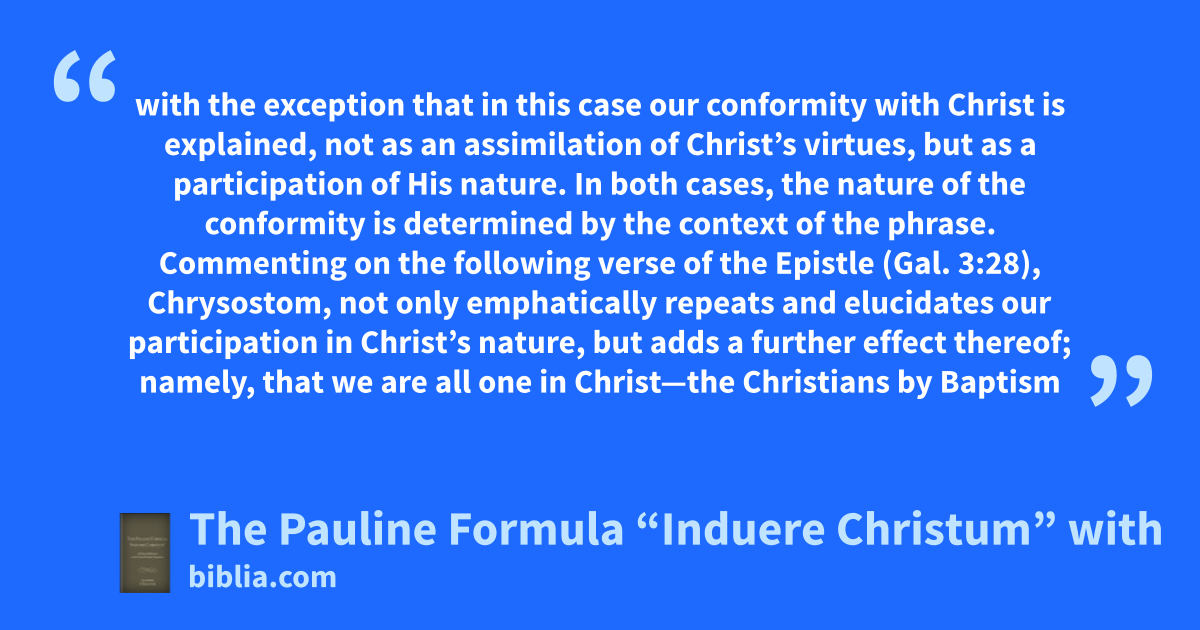 with the exception that in this case our conformity with Christ is explained, not as an assimilation of Christ’s virtues, but as a participation of His nature. In both cases, the nature of the conformity is determined by the context of the phrase. Commenting on the following verse of the Epistle (Gal. 3:28), Chrysostom, not only emphatically repeats and elucidates our participation in Christ’s nature, but adds a further effect thereof; namely, that we are all one in Christ—the Christians by Baptism