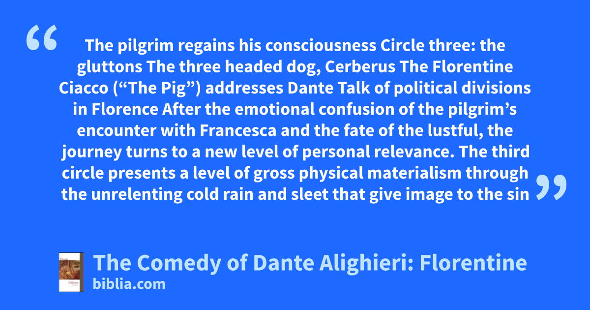 The pilgrim regains his consciousness Circle three: the gluttons The three headed dog, Cerberus The Florentine Ciacco (“The Pig”) addresses Dante Talk of political divisions in Florence After the emotional confusion of the pilgrim’s encounter with Francesca and the fate of the lustful, the journey turns to a new level of personal relevance. The third circle presents a level of gross physical materialism through the unrelenting cold rain and sleet that give image to the sin