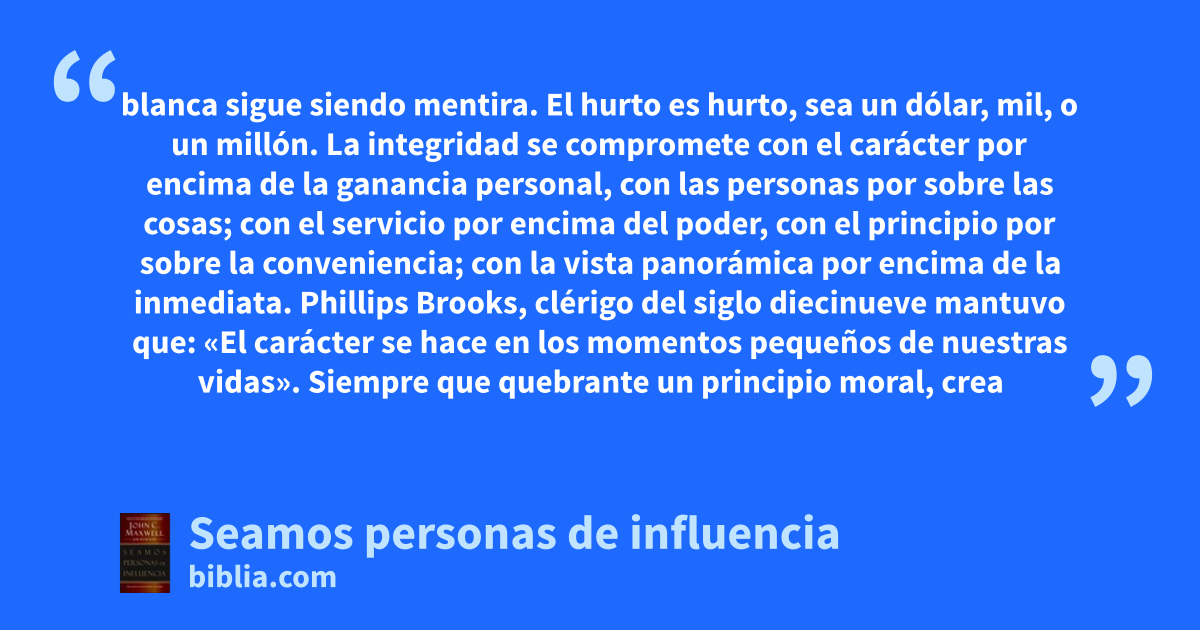 blanca sigue siendo mentira. El hurto es hurto, sea un dólar, mil, o un millón. La integridad se compromete con el carácter por encima de la ganancia personal, con las personas por sobre las cosas; con el servicio por encima del poder, con el principio por sobre la conveniencia; con la vista panorámica por encima de la inmediata. Phillips Brooks, clérigo del siglo diecinueve mantuvo que: «El carácter se hace en los momentos pequeños de nuestras vidas». Siempre que quebrante un principio moral, crea