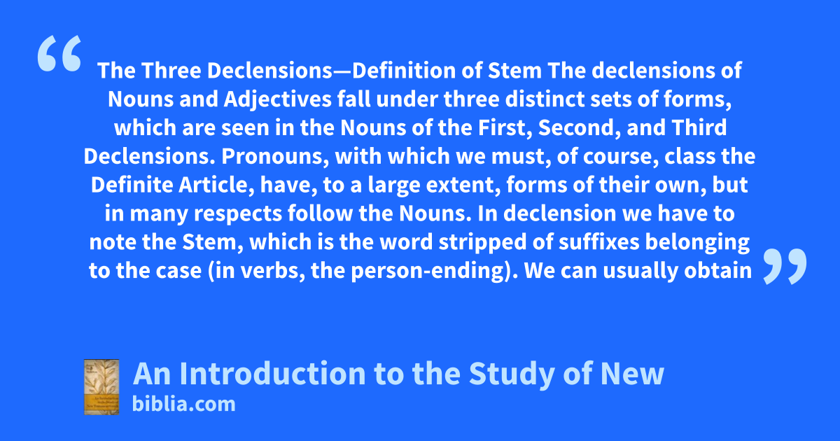 The Three Declensions—Definition of Stem The declensions of Nouns and Adjectives fall under three distinct sets of forms, which are seen in the Nouns of the First, Second, and Third Declensions. Pronouns, with which we must, of course, class the Definite Article, have, to a large extent, forms of their own, but in many respects follow the Nouns. In declension we have to note the Stem, which is the word stripped of suffixes belonging to the case (in verbs, the person-ending). We can usually obtain