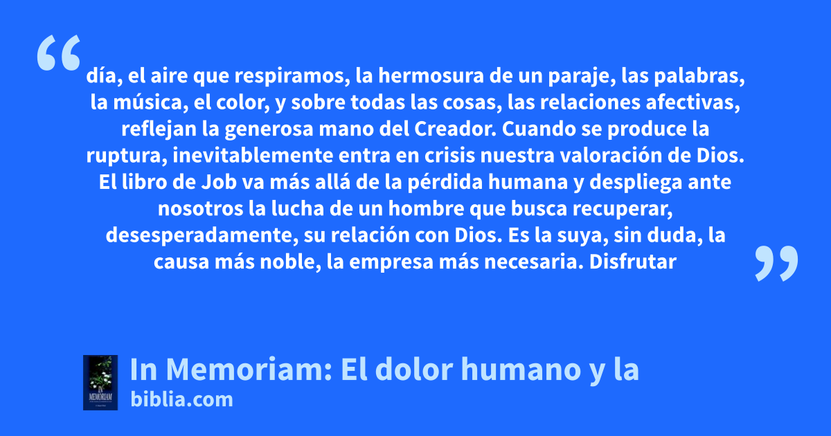 día, el aire que respiramos, la hermosura de un paraje, las palabras, la música, el color, y sobre todas las cosas, las relaciones afectivas, reflejan la generosa mano del Creador. Cuando se produce la ruptura, inevitablemente entra en crisis nuestra valoración de Dios. El libro de Job va más allá de la pérdida humana y despliega ante nosotros la lucha de un hombre que busca recuperar, desesperadamente, su relación con Dios. Es la suya, sin duda, la causa más noble, la empresa más necesaria. Disfrutar