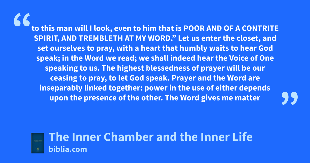 to this man will I look, even to him that is POOR AND OF A CONTRITE SPIRIT, AND TREMBLETH AT MY WORD.” Let us enter the closet, and set ourselves to pray, with a heart that humbly waits to hear God speak; in the Word we read; we shall indeed hear the Voice of One speaking to us. The highest blessedness of prayer will be our ceasing to pray, to let God speak. Prayer and the Word are inseparably linked together: power in the use of either depends upon the presence of the other. The Word gives me matter