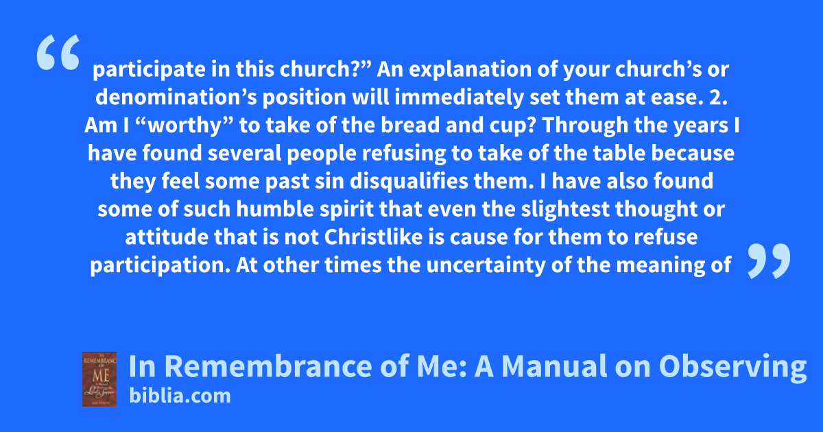 participate in this church?” An explanation of your church’s or denomination’s position will immediately set them at ease. 2. Am I “worthy” to take of the bread and cup? Through the years I have found several people refusing to take of the table because they feel some past sin disqualifies them. I have also found some of such humble spirit that even the slightest thought or attitude that is not Christlike is cause for them to refuse participation. At other times the uncertainty of the meaning of
