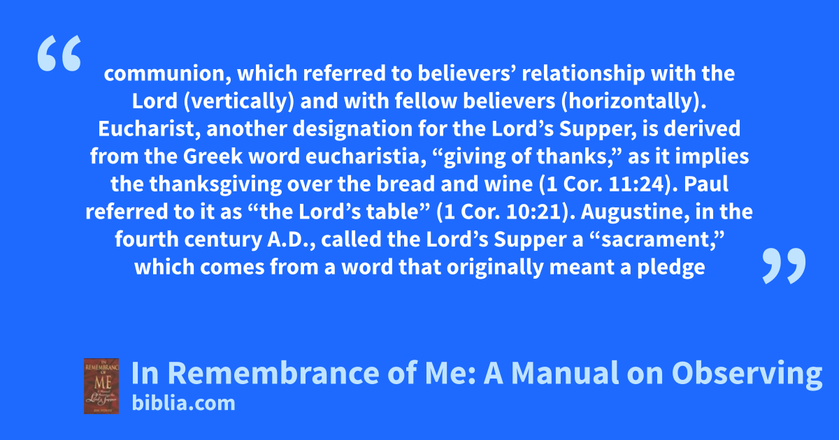 communion, which referred to believers’ relationship with the Lord (vertically) and with fellow believers (horizontally). Eucharist, another designation for the Lord’s Supper, is derived from the Greek word eucharistia, “giving of thanks,” as it implies the thanksgiving over the bread and wine (1 Cor. 11:24). Paul referred to it as “the Lord’s table” (1 Cor. 10:21). Augustine, in the fourth century A.D., called the Lord’s Supper a “sacrament,” which comes from a word that originally meant a pledge