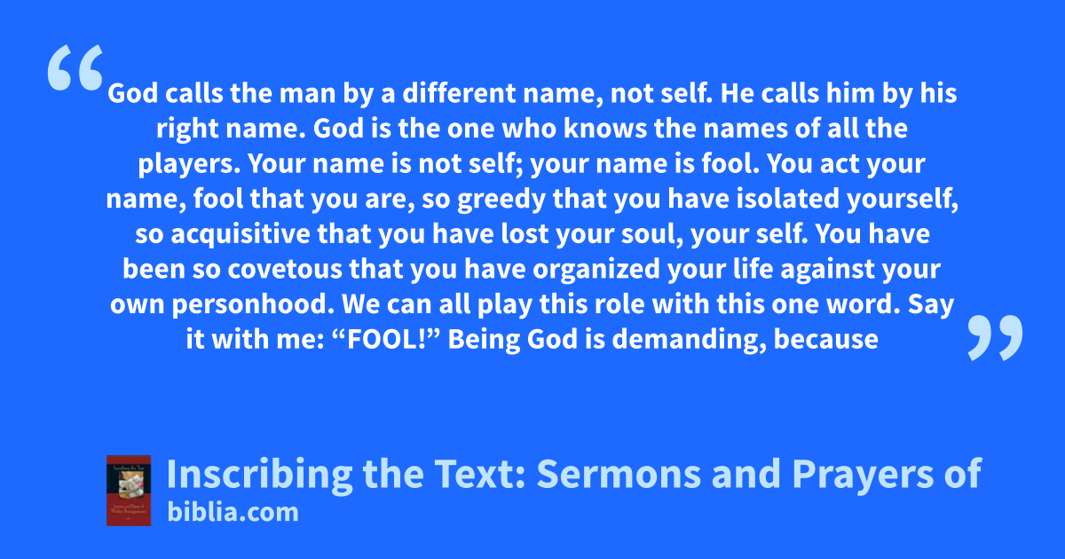 God calls the man by a different name, not self. He calls him by his right name. God is the one who knows the names of all the players. Your name is not self; your name is fool. You act your name, fool that you are, so greedy that you have isolated yourself, so acquisitive that you have lost your soul, your self. You have been so covetous that you have organized your life against your own personhood. We can all play this role with this one word. Say it with me: “FOOL!” Being God is demanding, because