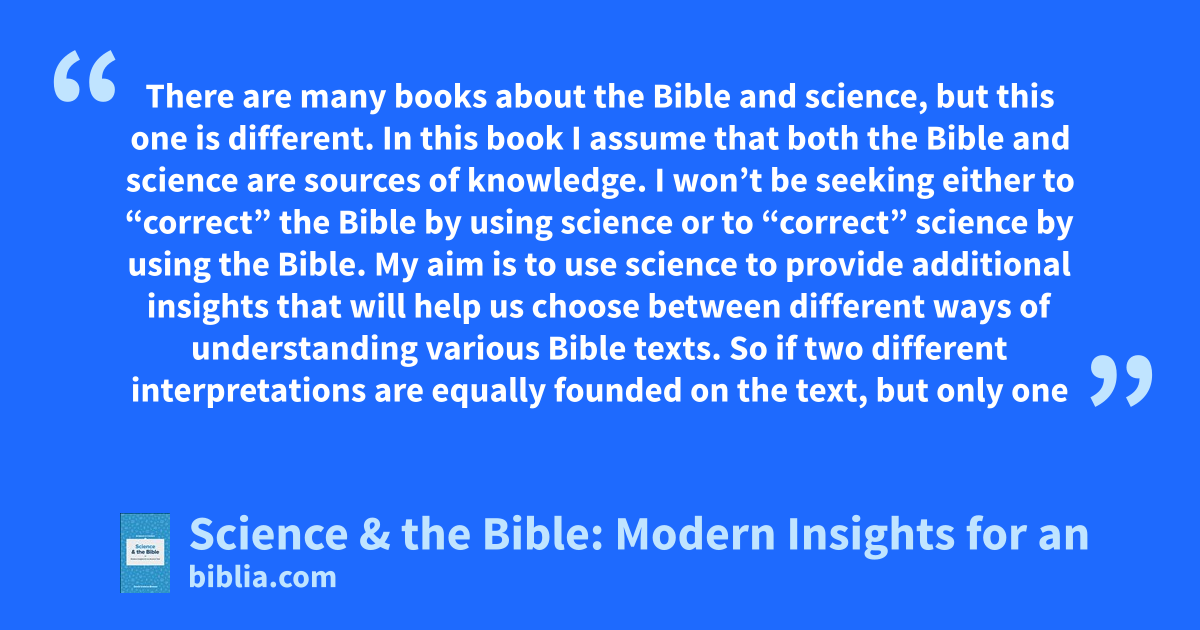 There are many books about the Bible and science, but this one is different. In this book I assume that both the Bible and science are sources of knowledge. I won’t be seeking either to “correct” the Bible by using science or to “correct” science by using the Bible. My aim is to use science to provide additional insights that will help us choose between different ways of understanding various Bible texts. So if two different interpretations are equally founded on the text, but only one