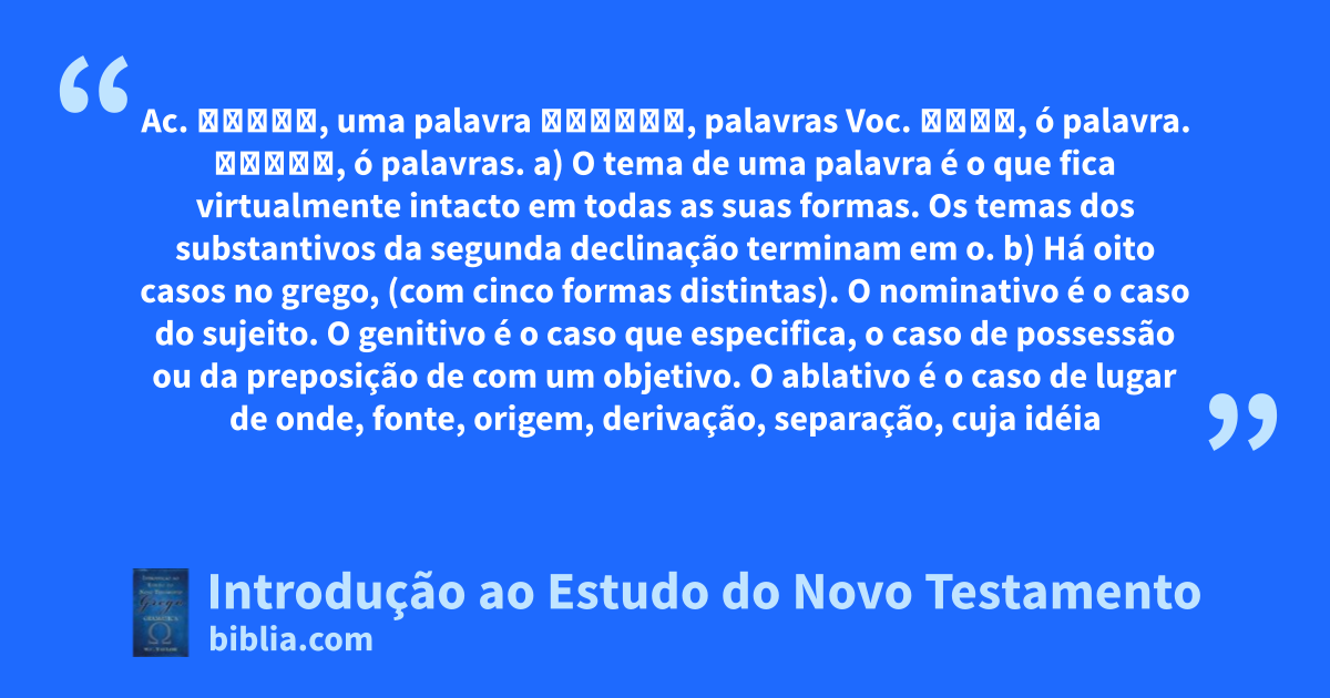 Ac. λόγον, uma palavra λόγους, palavras Voc. λόγε, ó palavra. λόγοι, ó palavras. a) O tema de uma palavra é o que fica virtualmente intacto em todas as suas formas. Os temas dos substantivos da segunda declinação terminam em o. b) Há oito casos no grego, (com cinco formas distintas). O nominativo é o caso do sujeito. O genitivo é o caso que especifica, o caso de possessão ou da preposição de com um objetivo. O ablativo é o caso de lugar de onde, fonte, origem, derivação, separação, cuja idéia