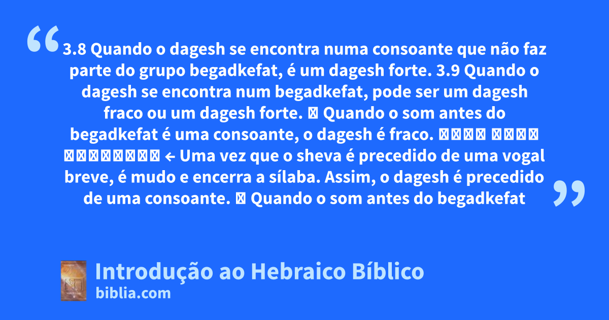 3.8 Quando o dagesh se encontra numa consoante que não faz parte do grupo begadkefat, é um dagesh forte. 3.9 Quando o dagesh se encontra num begadkefat, pode ser um dagesh fraco ou um dagesh forte. ➤ Quando o som antes do begadkefat é uma consoante, o dagesh é fraco. בָּר מִדְ מִדְבָּר ← Uma vez que o sheva é precedido de uma vogal breve, é mudo e encerra a sílaba. Assim, o dagesh é precedido de uma consoante. ➤ Quando o som antes do begadkefat