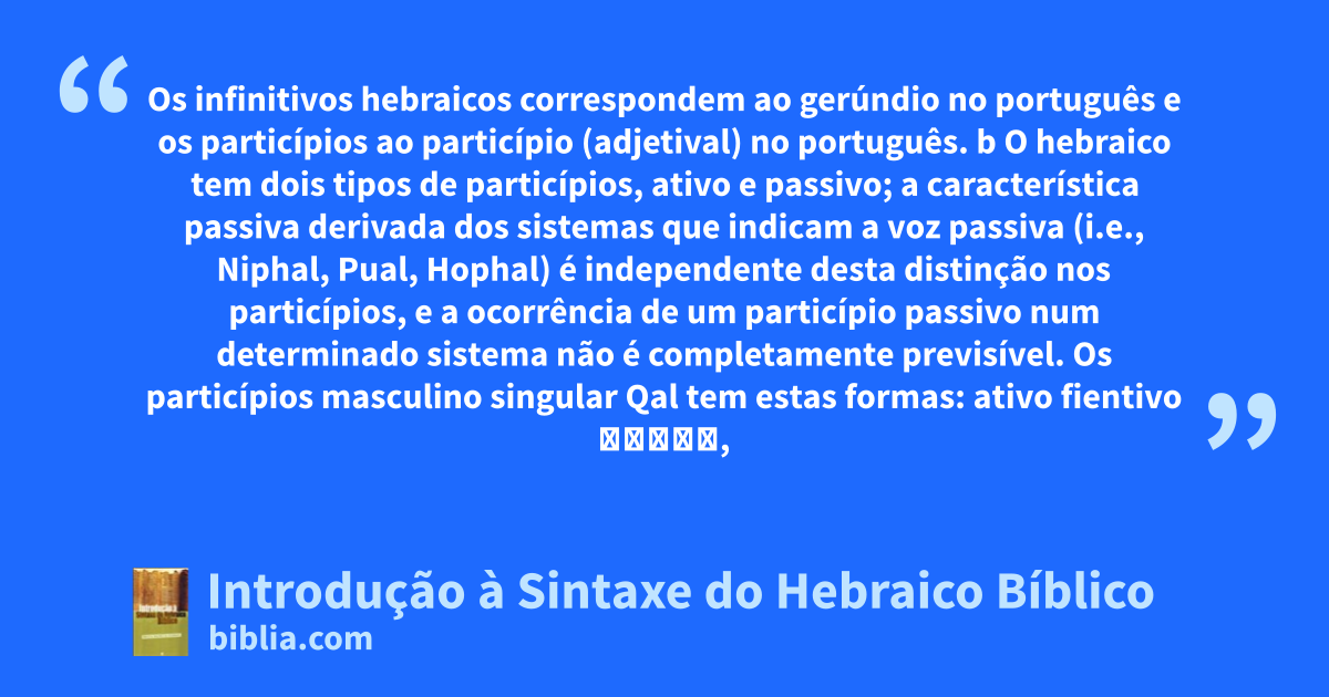 Os infinitivos hebraicos correspondem ao gerúndio no português e os particípios ao particípio (adjetival) no português. b O hebraico tem dois tipos de particípios, ativo e passivo; a característica passiva derivada dos sistemas que indicam a voz passiva (i.e., Niphal, Pual, Hophal) é independente desta distinção nos particípios, e a ocorrência de um particípio passivo num determinado sistema não é completamente previsível. Os particípios masculino singular Qal tem estas formas: ativo fientivo קֹטֵל,