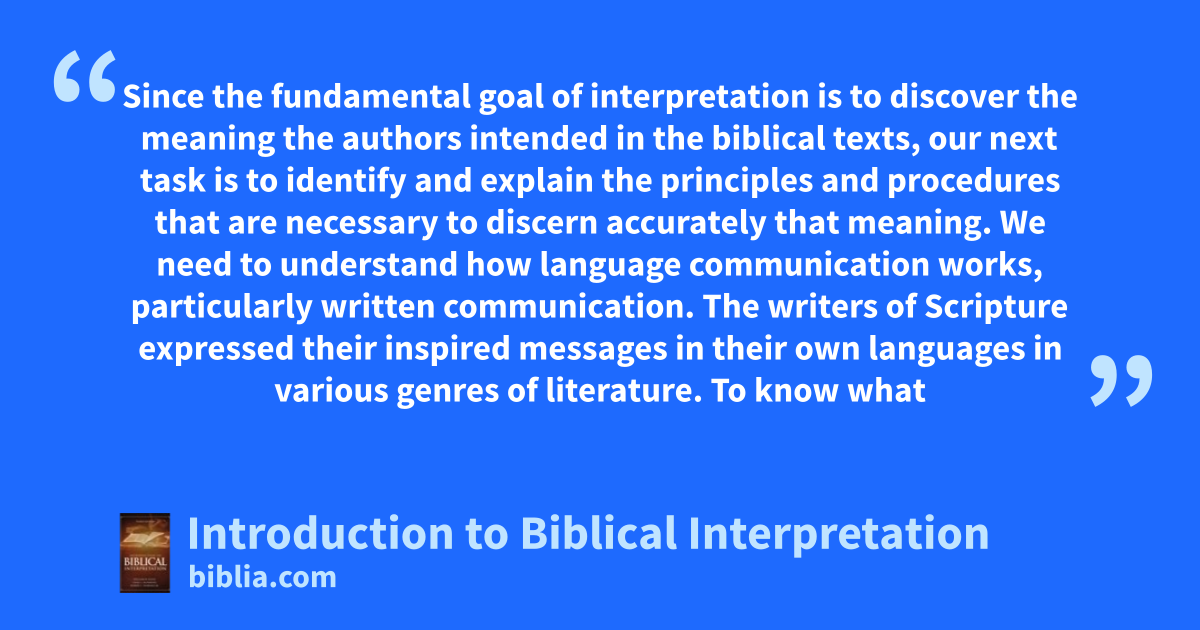Since the fundamental goal of interpretation is to discover the meaning the authors intended in the biblical texts, our next task is to identify and explain the principles and procedures that are necessary to discern accurately that meaning. We need to understand how language communication works, particularly written communication. The writers of Scripture expressed their inspired messages in their own languages in various genres of literature. To know what