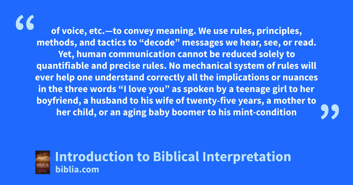 of voice, etc.—to convey meaning. We use rules, principles, methods, and tactics to “decode” messages we hear, see, or read. Yet, human communication cannot be reduced solely to quantifiable and precise rules. No mechanical system of rules will ever help one understand correctly all the implications or nuances in the three words “I love you” as spoken by a teenage girl to her boyfriend, a husband to his wife of twenty-five years, a mother to her child, or an aging baby boomer to his mint-condition