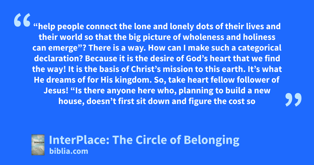 “help people connect the lone and lonely dots of their lives and their world so that the big picture of wholeness and holiness can emerge”? There is a way. How can I make such a categorical declaration? Because it is the desire of God’s heart that we find the way! It is the basis of Christ’s mission to this earth. It’s what He dreams of for His kingdom. So, take heart fellow follower of Jesus! “Is there anyone here who, planning to build a new house, doesn’t first sit down and figure the cost so