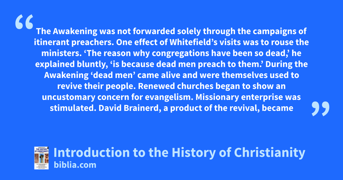 The Awakening was not forwarded solely through the campaigns of itinerant preachers. One effect of Whitefield’s visits was to rouse the ministers. ‘The reason why congregations have been so dead,’ he explained bluntly, ‘is because dead men preach to them.’ During the Awakening ‘dead men’ came alive and were themselves used to revive their people. Renewed churches began to show an uncustomary concern for evangelism. Missionary enterprise was stimulated. David Brainerd, a product of the revival, became