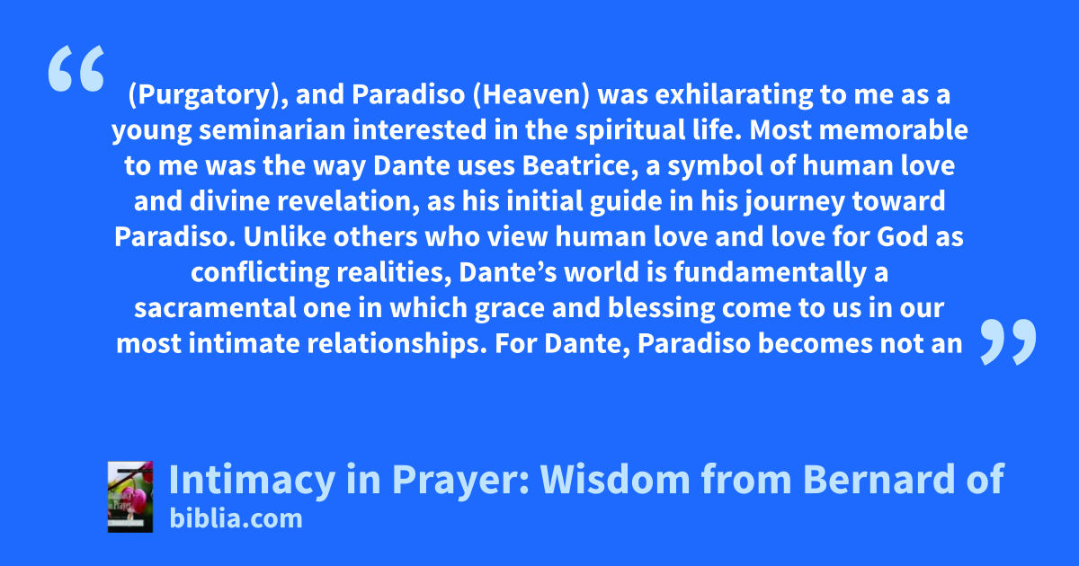 (Purgatory), and Paradiso (Heaven) was exhilarating to me as a young seminarian interested in the spiritual life. Most memorable to me was the way Dante uses Beatrice, a symbol of human love and divine revelation, as his initial guide in his journey toward Paradiso. Unlike others who view human love and love for God as conflicting realities, Dante’s world is fundamentally a sacramental one in which grace and blessing come to us in our most intimate relationships. For Dante, Paradiso becomes not an