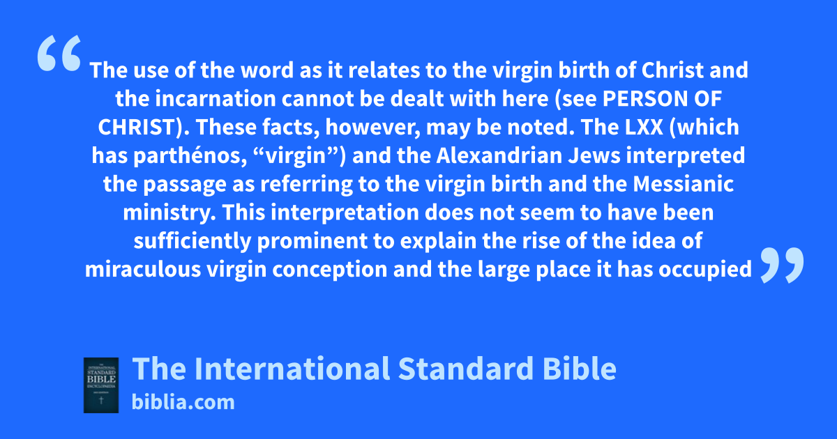 The use of the word as it relates to the virgin birth of Christ and the incarnation cannot be dealt with here (see PERSON OF CHRIST). These facts, however, may be noted. The LXX (which has parthénos, “virgin”) and the Alexandrian Jews interpreted the passage as referring to the virgin birth and the Messianic ministry. This interpretation does not seem to have been sufficiently prominent to explain the rise of the idea of miraculous virgin conception and the large place it has occupied