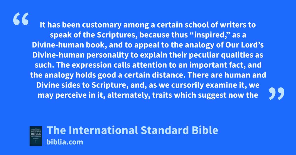 It has been customary among a certain school of writers to speak of the Scriptures, because thus “inspired,” as a Divine-human book, and to appeal to the analogy of Our Lord’s Divine-human personality to explain their peculiar qualities as such. The expression calls attention to an important fact, and the analogy holds good a certain distance. There are human and Divine sides to Scripture, and, as we cursorily examine it, we may perceive in it, alternately, traits which suggest now the
