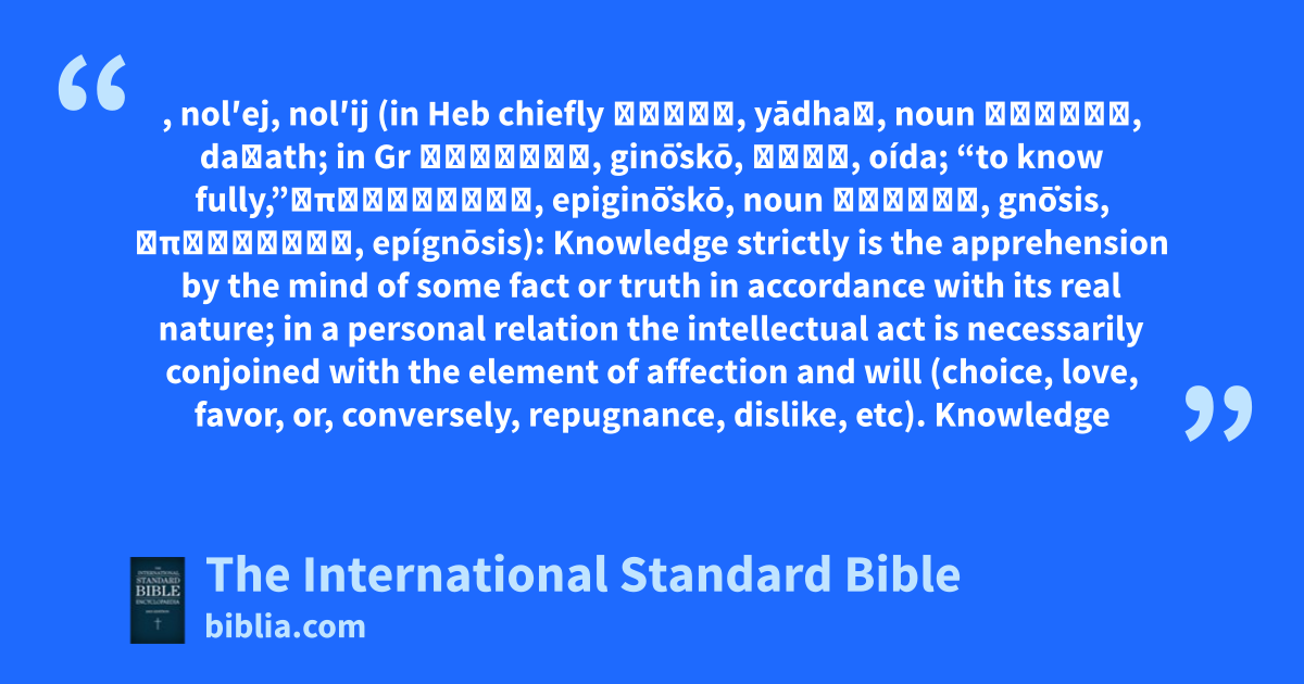 , nolʹej, nolʹij (in Heb chiefly יָדַע, yādhaʽ, noun דַּעַת, daʽath; in Gr γινώσκω, ginō̇skō, οἶδα, oída; “to know fully,”ἐπιγινώσκω, epiginō̇skō, noun γνῶσις, gnō̇sis, ἐπίγνωσις, epígnōsis): Knowledge strictly is the apprehension by the mind of some fact or truth in accordance with its real nature; in a personal relation the intellectual act is necessarily conjoined with the element of affection and will (choice, love, favor, or, conversely, repugnance, dislike, etc). Knowledge
