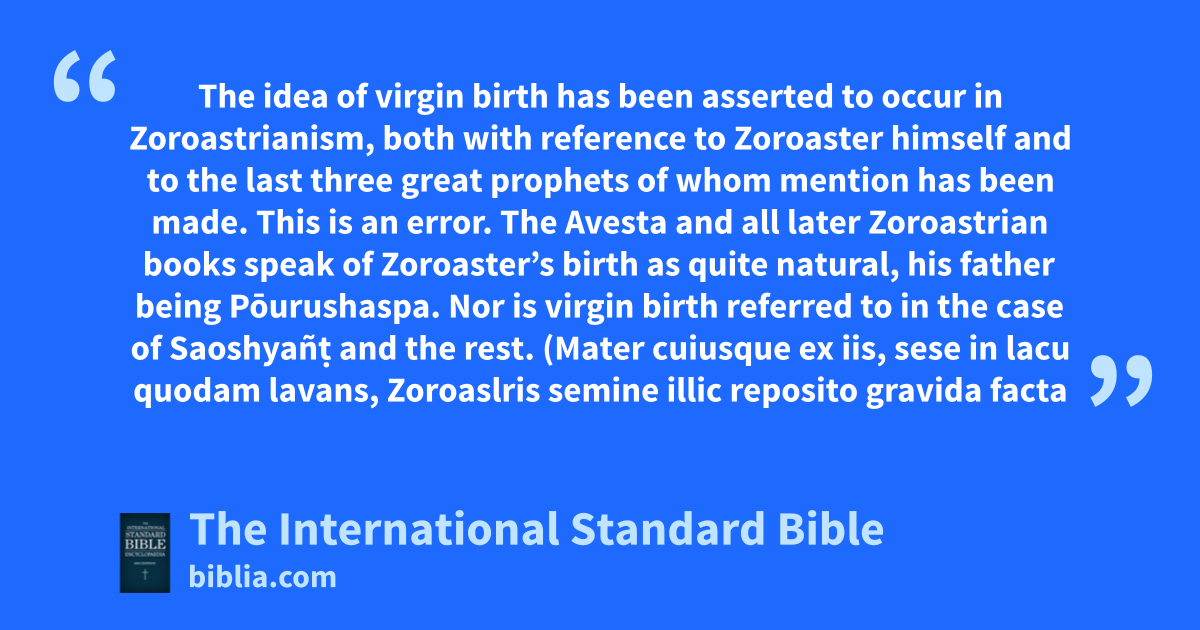 The idea of virgin birth has been asserted to occur in Zoroastrianism, both with reference to Zoroaster himself and to the last three great prophets of whom mention has been made. This is an error. The Avesta and all later Zoroastrian books speak of Zoroaster’s birth as quite natural, his father being Pōurushaspa. Nor is virgin birth referred to in the case of Saoshyañṭ and the rest. (Mater cuiusque ex iis, sese in lacu quodam lavans, Zoroaslris semine illic reposito gravida facta