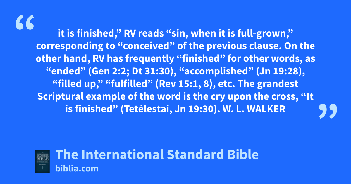 it is finished,” RV reads “sin, when it is full-grown,” corresponding to “conceived” of the previous clause. On the other hand, RV has frequently “finished” for other words, as “ended” (Gen 2:2; Dt 31:30), “accomplished” (Jn 19:28), “filled up,” “fulfilled” (Rev 15:1, 8), etc. The grandest Scriptural example of the word is the cry upon the cross, “It is finished” (Tetélestai, Jn 19:30). W. L. WALKER