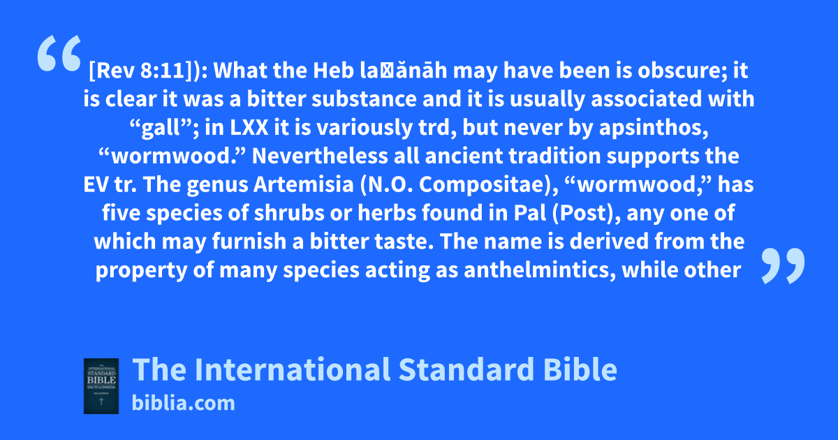 [Rev 8:11]): What the Heb la‛ănāh may have been is obscure; it is clear it was a bitter substance and it is usually associated with “gall”; in LXX it is variously trd, but never by apsinthos, “wormwood.” Nevertheless all ancient tradition supports the EV tr. The genus Artemisia (N.O. Compositae), “wormwood,” has five species of shrubs or herbs found in Pal (Post), any one of which may furnish a bitter taste. The name is derived from the property of many species acting as anthelmintics, while other