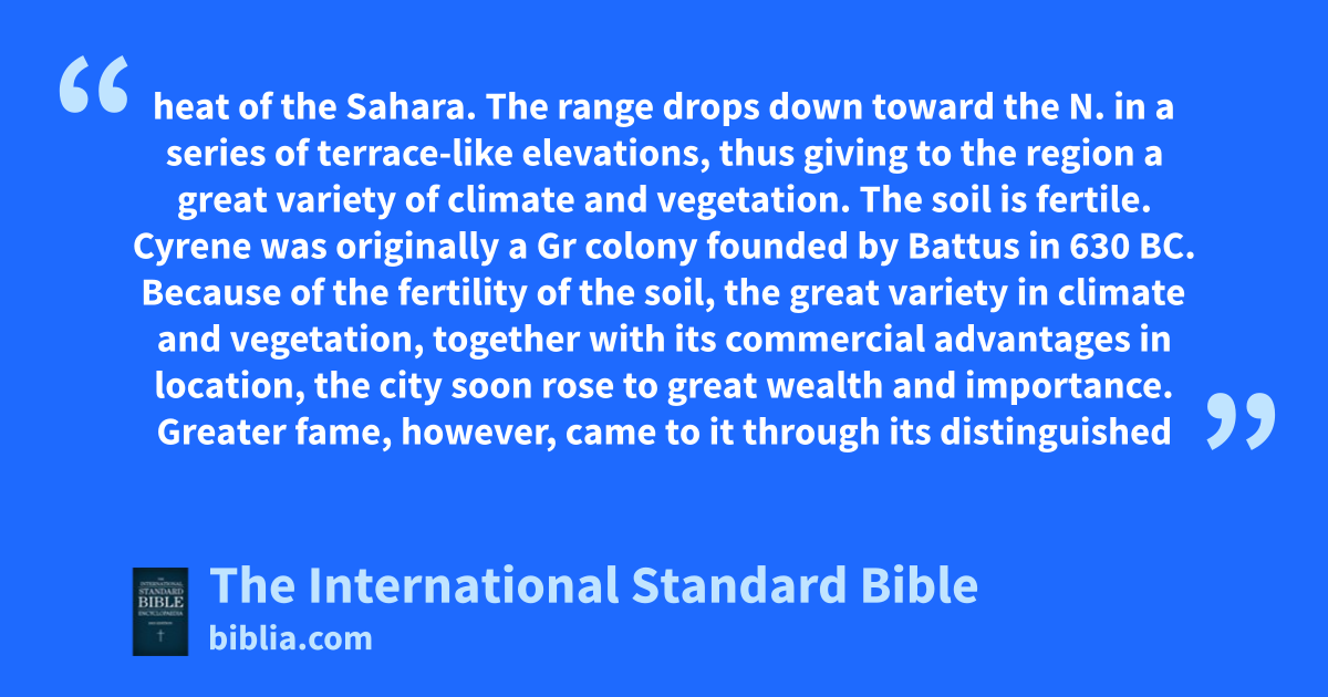 heat of the Sahara. The range drops down toward the N. in a series of terrace-like elevations, thus giving to the region a great variety of climate and vegetation. The soil is fertile. Cyrene was originally a Gr colony founded by Battus in 630 BC. Because of the fertility of the soil, the great variety in climate and vegetation, together with its commercial advantages in location, the city soon rose to great wealth and importance. Greater fame, however, came to it through its distinguished