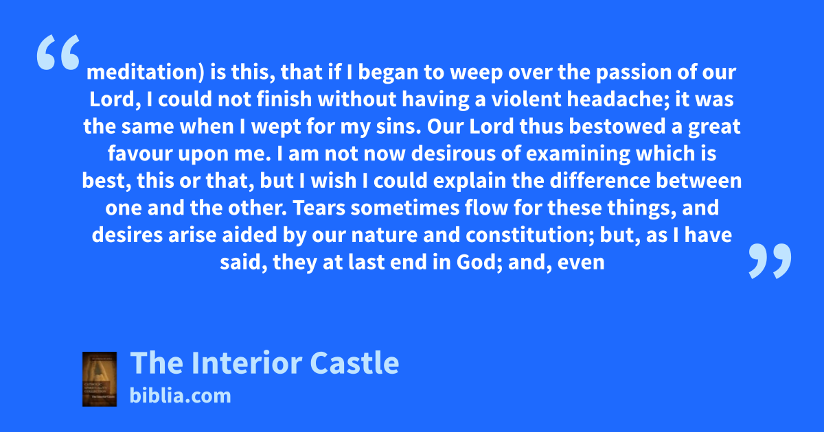 meditation) is this, that if I began to weep over the passion of our Lord, I could not finish without having a violent headache; it was the same when I wept for my sins. Our Lord thus bestowed a great favour upon me. I am not now desirous of examining which is best, this or that, but I wish I could explain the difference between one and the other. Tears sometimes flow for these things, and desires arise aided by our nature and constitution; but, as I have said, they at last end in God; and, even