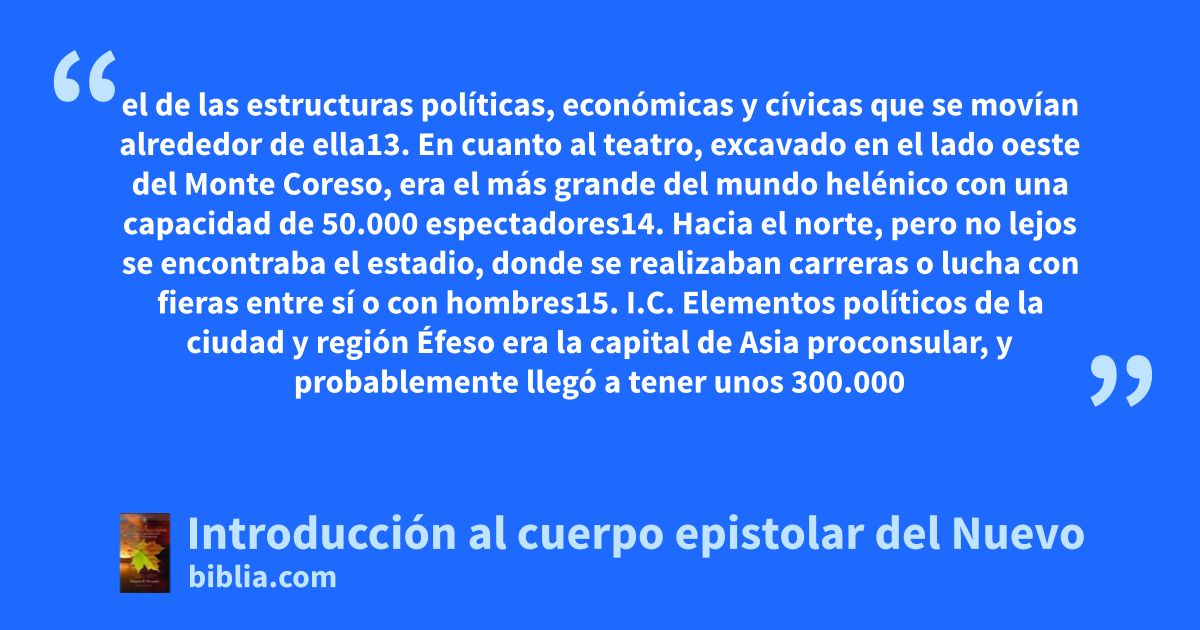 el de las estructuras políticas, económicas y cívicas que se movían alrededor de ella13. En cuanto al teatro, excavado en el lado oeste del Monte Coreso, era el más grande del mundo helénico con una capacidad de 50.000 espectadores14. Hacia el norte, pero no lejos se encontraba el estadio, donde se realizaban carreras o lucha con fieras entre sí o con hombres15. I.C. Elementos políticos de la ciudad y región Éfeso era la capital de Asia proconsular, y probablemente llegó a tener unos 300.000