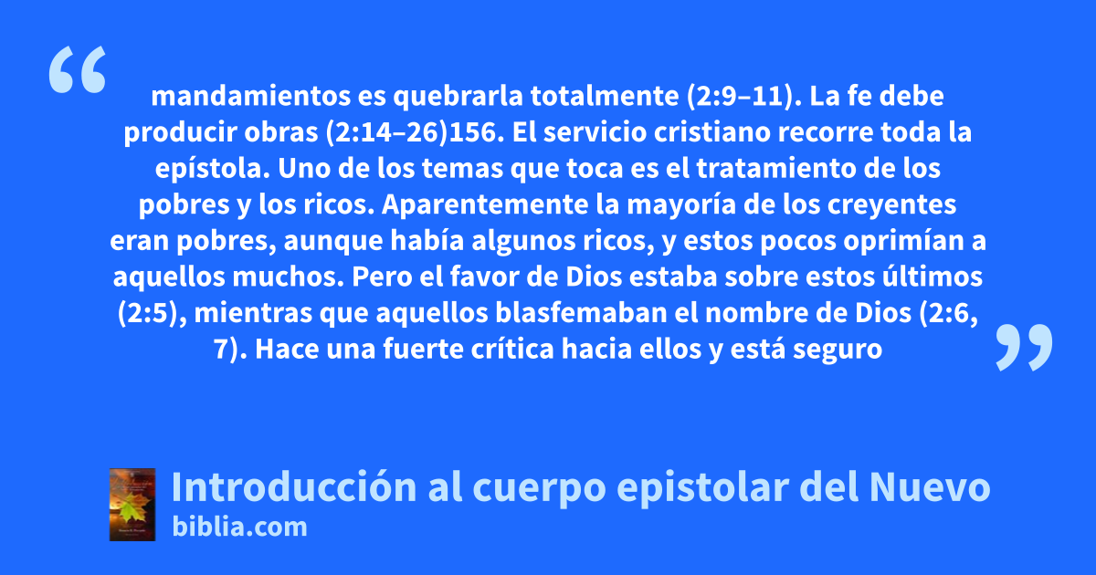 mandamientos es quebrarla totalmente (2:9–11). La fe debe producir obras (2:14–26)156. El servicio cristiano recorre toda la epístola. Uno de los temas que toca es el tratamiento de los pobres y los ricos. Aparentemente la mayoría de los creyentes eran pobres, aunque había algunos ricos, y estos pocos oprimían a aquellos muchos. Pero el favor de Dios estaba sobre estos últimos (2:5), mientras que aquellos blasfemaban el nombre de Dios (2:6, 7). Hace una fuerte crítica hacia ellos y está seguro