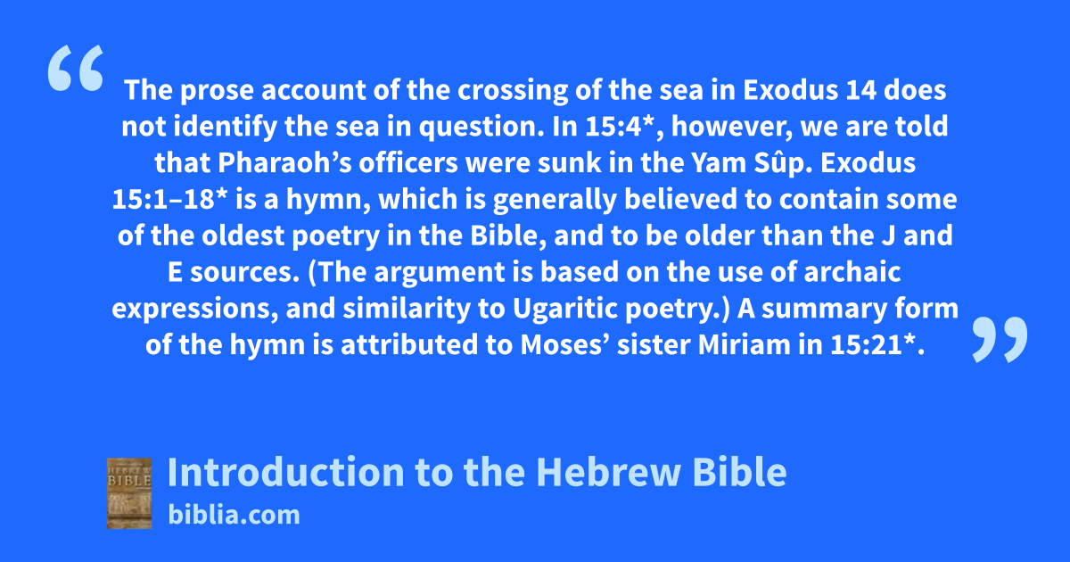 The prose account of the crossing of the sea in Exodus 14 does not identify the sea in question. In 15:4*, however, we are told that Pharaoh’s officers were sunk in the Yam Sûp. Exodus 15:1–18* is a hymn, which is generally believed to contain some of the oldest poetry in the Bible, and to be older than the J and E sources. (The argument is based on the use of archaic expressions, and similarity to Ugaritic poetry.) A summary form of the hymn is attributed to Moses’ sister Miriam in 15:21*.