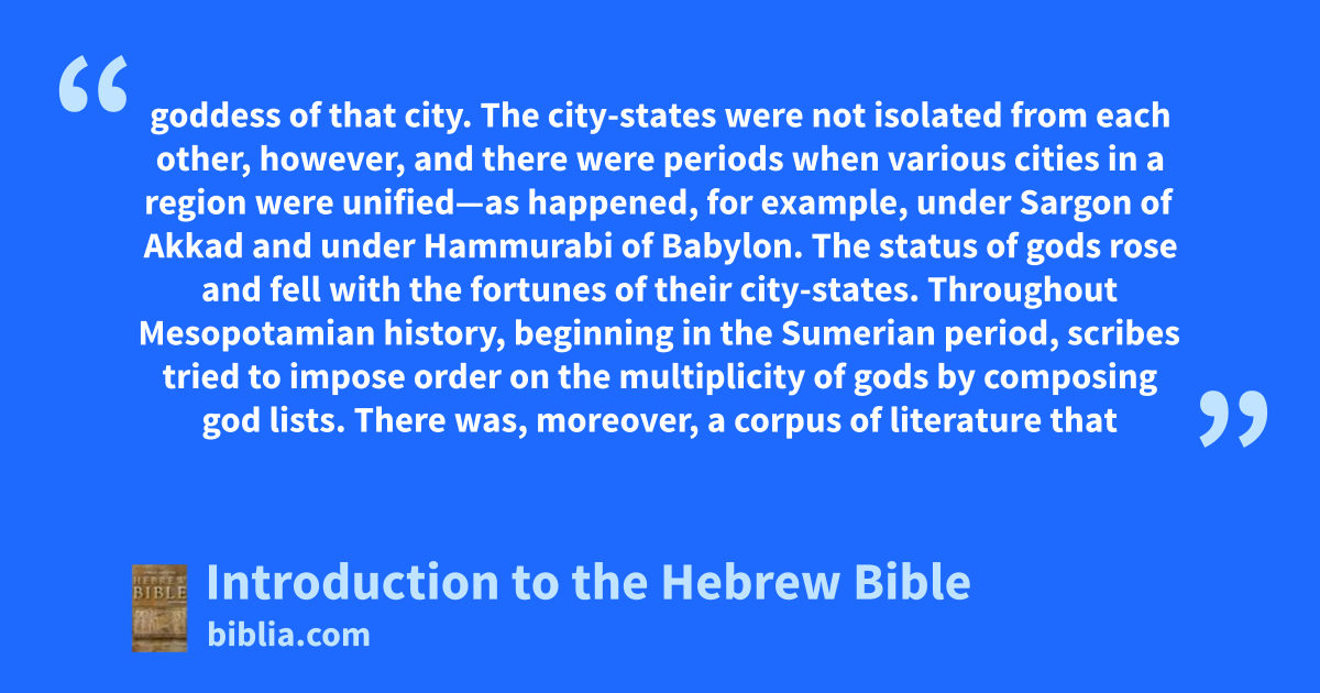 goddess of that city. The city-states were not isolated from each other, however, and there were periods when various cities in a region were unified—as happened, for example, under Sargon of Akkad and under Hammurabi of Babylon. The status of gods rose and fell with the fortunes of their city-states. Throughout Mesopotamian history, beginning in the Sumerian period, scribes tried to impose order on the multiplicity of gods by composing god lists. There was, moreover, a corpus of literature that