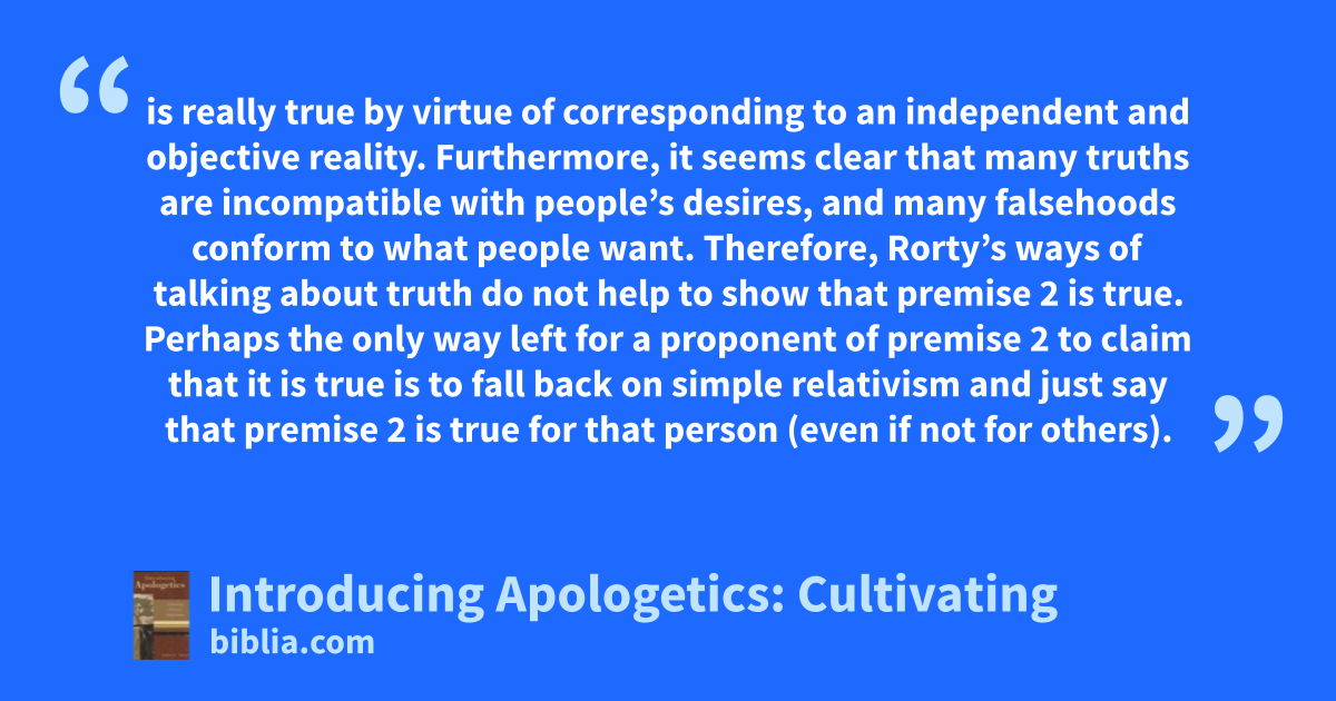 is really true by virtue of corresponding to an independent and objective reality. Furthermore, it seems clear that many truths are incompatible with people’s desires, and many falsehoods conform to what people want. Therefore, Rorty’s ways of talking about truth do not help to show that premise 2 is true. Perhaps the only way left for a proponent of premise 2 to claim that it is true is to fall back on simple relativism and just say that premise 2 is true for that person (even if not for others).