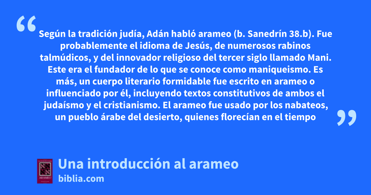 Según la tradición judía, Adán habló arameo (b. Sanedrín 38.b). Fue probablemente el idioma de Jesús, de numerosos rabinos talmúdicos, y del innovador religioso del tercer siglo llamado Mani. Este era el fundador de lo que se conoce como maniqueismo. Es más, un cuerpo literario formidable fue escrito en arameo o influenciado por él, incluyendo textos constitutivos de ambos el judaísmo y el cristianismo. El arameo fue usado por los nabateos, un pueblo árabe del desierto, quienes florecían en el tiempo