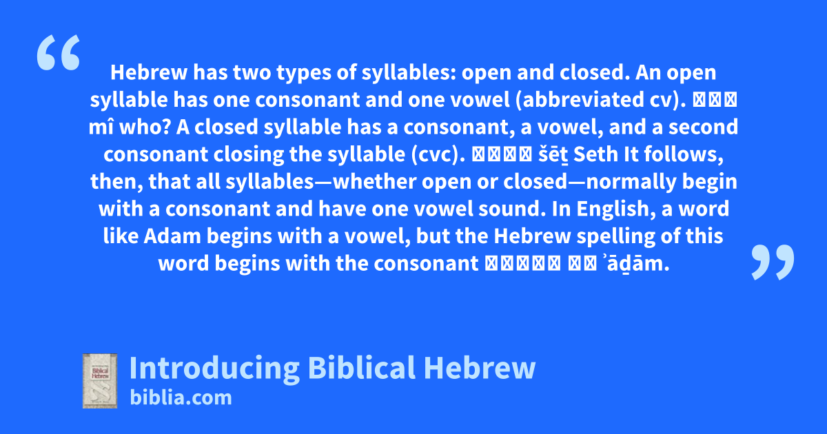 Hebrew has two types of syllables: open and closed. An open syllable has one consonant and one vowel (abbreviated cv). מִי mî who? A closed syllable has a consonant, a vowel, and a second consonant closing the syllable (cvc). שֵׁת šēṯ Seth It follows, then, that all syllables—whether open or closed—normally begin with a consonant and have one vowel sound. In English, a word like Adam begins with a vowel, but the Hebrew spelling of this word begins with the consonant אָדָם ׃א ʾāḏām.