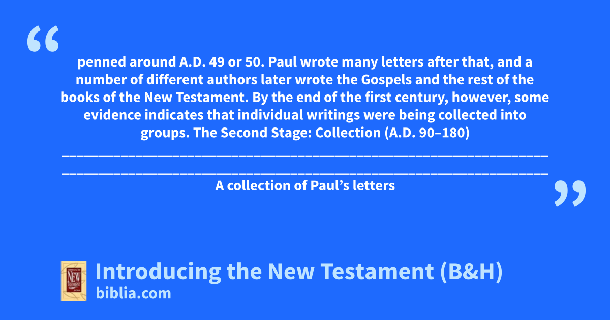 penned around A.D. 49 or 50. Paul wrote many letters after that, and a number of different authors later wrote the Gospels and the rest of the books of the New Testament. By the end of the first century, however, some evidence indicates that individual writings were being collected into groups. The Second Stage: Collection (A.D. 90–180) __________________________________________________________________ __________________________________________________________________ A collection of Paul’s letters