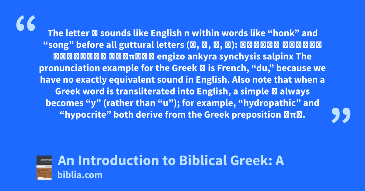 The letter γ sounds like English n within words like “honk” and “song” before all guttural letters (γ, κ, χ, ξ): ἐγγίζω ἄγκυρα σύγχυσις σάλπιγξ engizo ankyra synchysis salpinx The pronunciation example for the Greek υ is French, “du,” because we have no exactly equivalent sound in English. Also note that when a Greek word is transliterated into English, a simple υ always becomes “y” (rather than “u”); for example, “hydropathic” and “hypocrite” both derive from the Greek preposition ὑπό.