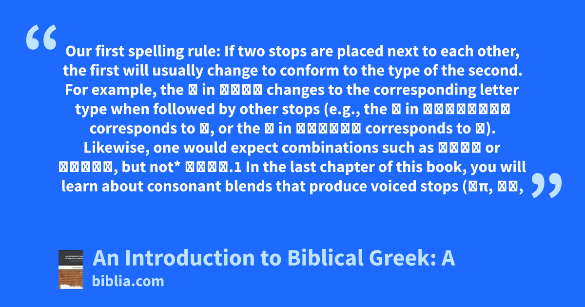 Our first spelling rule: If two stops are placed next to each other, the first will usually change to conform to the type of the second. For example, the γ in λέγω changes to the corresponding letter type when followed by other stops (e.g., the κ in λέλεκται corresponds to τ, or the χ in ἐλέχθη corresponds to θ). Likewise, one would expect combinations such as ὀκτώ or ὀγδόη, but not* ὀγτώ.1 In the last chapter of this book, you will learn about consonant blends that produce voiced stops (μπ, ντ,