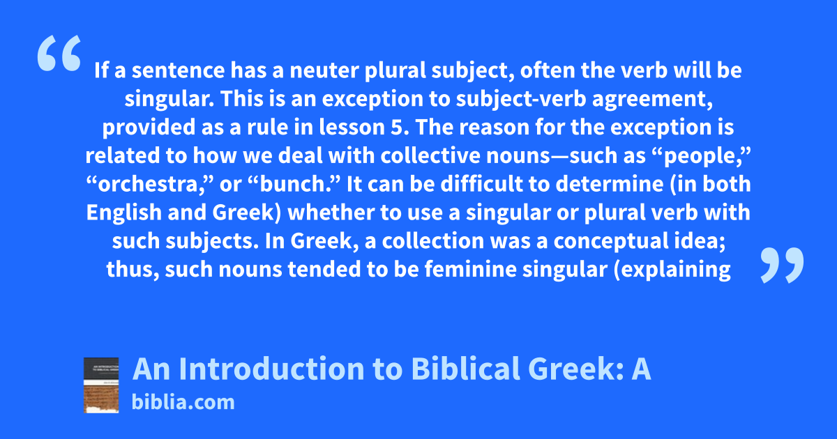 If a sentence has a neuter plural subject, often the verb will be singular. This is an exception to subject-verb agreement, provided as a rule in lesson 5. The reason for the exception is related to how we deal with collective nouns—such as “people,” “orchestra,” or “bunch.” It can be difficult to determine (in both English and Greek) whether to use a singular or plural verb with such subjects. In Greek, a collection was a conceptual idea; thus, such nouns tended to be feminine singular (explaining