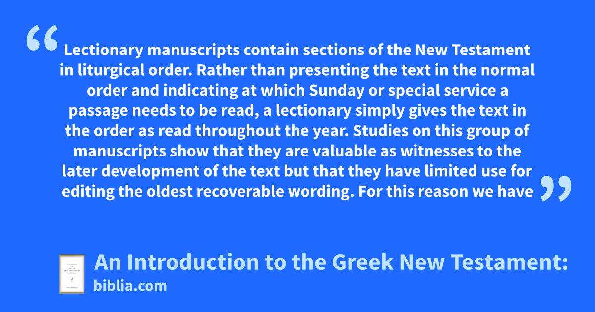 Lectionary manuscripts contain sections of the New Testament in liturgical order. Rather than presenting the text in the normal order and indicating at which Sunday or special service a passage needs to be read, a lectionary simply gives the text in the order as read throughout the year. Studies on this group of manuscripts show that they are valuable as witnesses to the later development of the text but that they have limited use for editing the oldest recoverable wording. For this reason we have