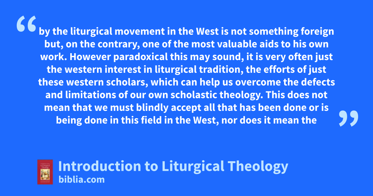 by the liturgical movement in the West is not something foreign but, on the contrary, one of the most valuable aids to his own work. However paradoxical this may sound, it is very often just the western interest in liturgical tradition, the efforts of just these western scholars, which can help us overcome the defects and limitations of our own scholastic theology. This does not mean that we must blindly accept all that has been done or is being done in this field in the West, nor does it mean the