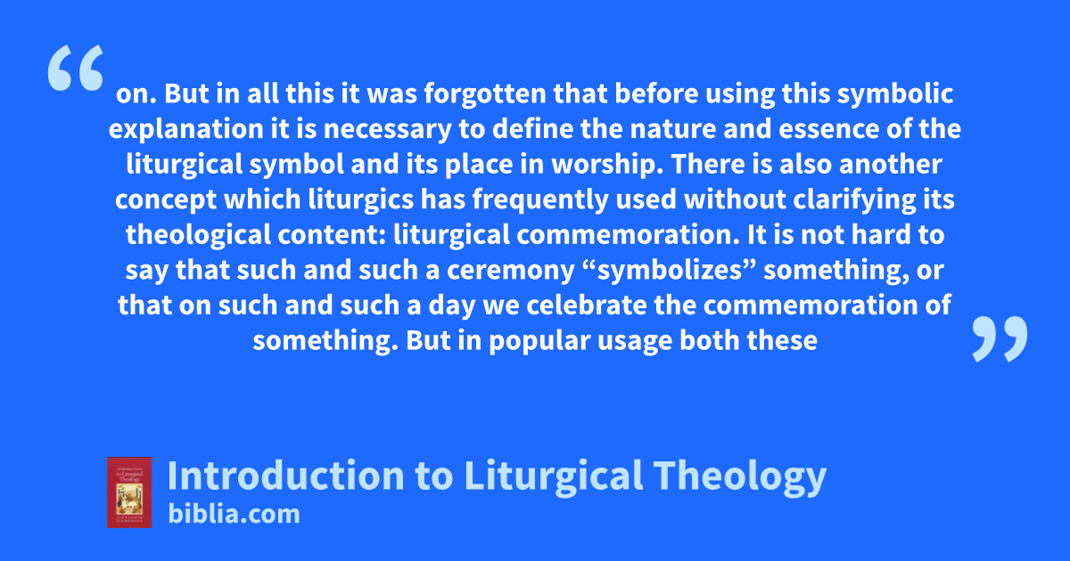 on. But in all this it was forgotten that before using this symbolic explanation it is necessary to define the nature and essence of the liturgical symbol and its place in worship. There is also another concept which liturgics has frequently used without clarifying its theological content: liturgical commemoration. It is not hard to say that such and such a ceremony “symbolizes” something, or that on such and such a day we celebrate the commemoration of something. But in popular usage both these